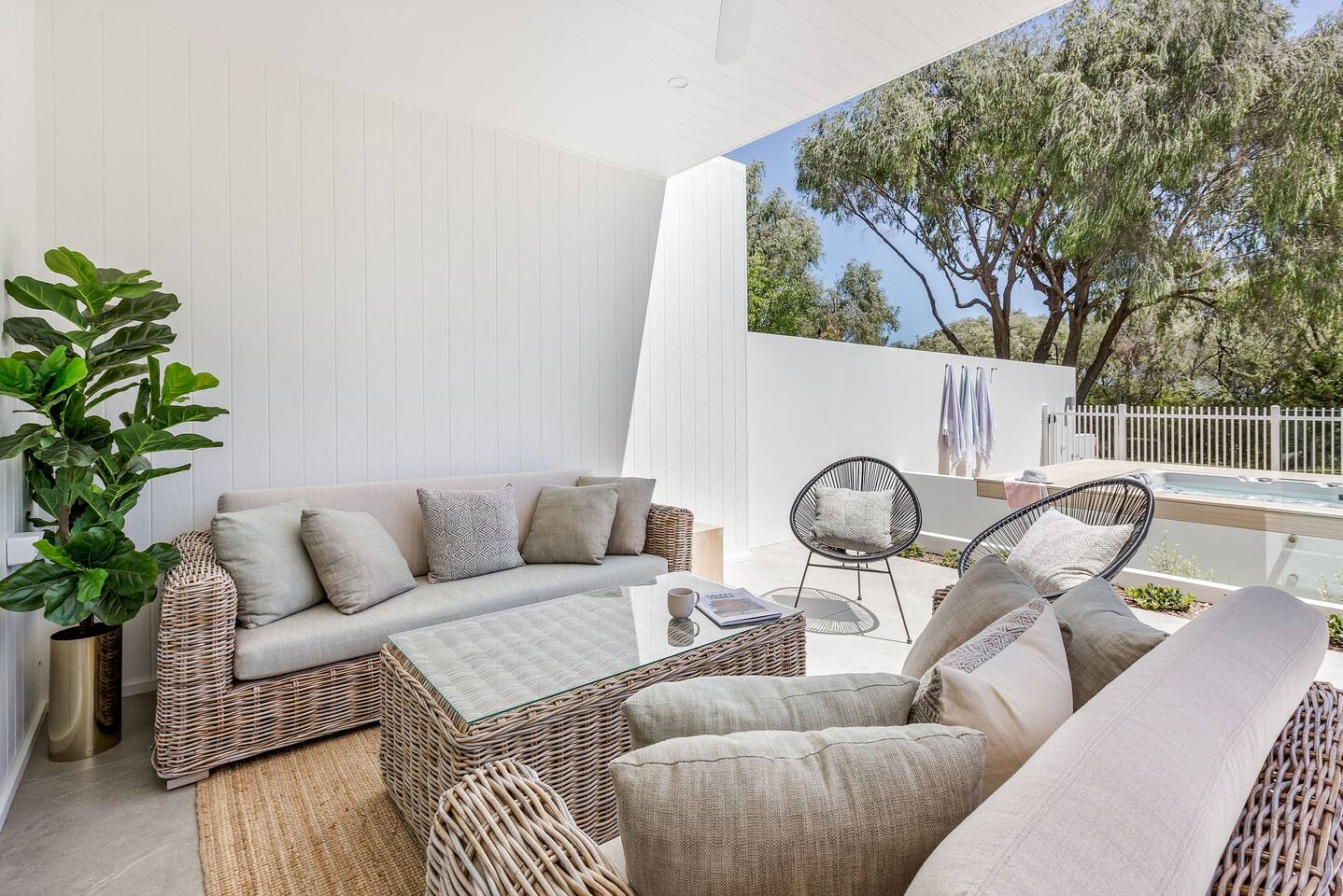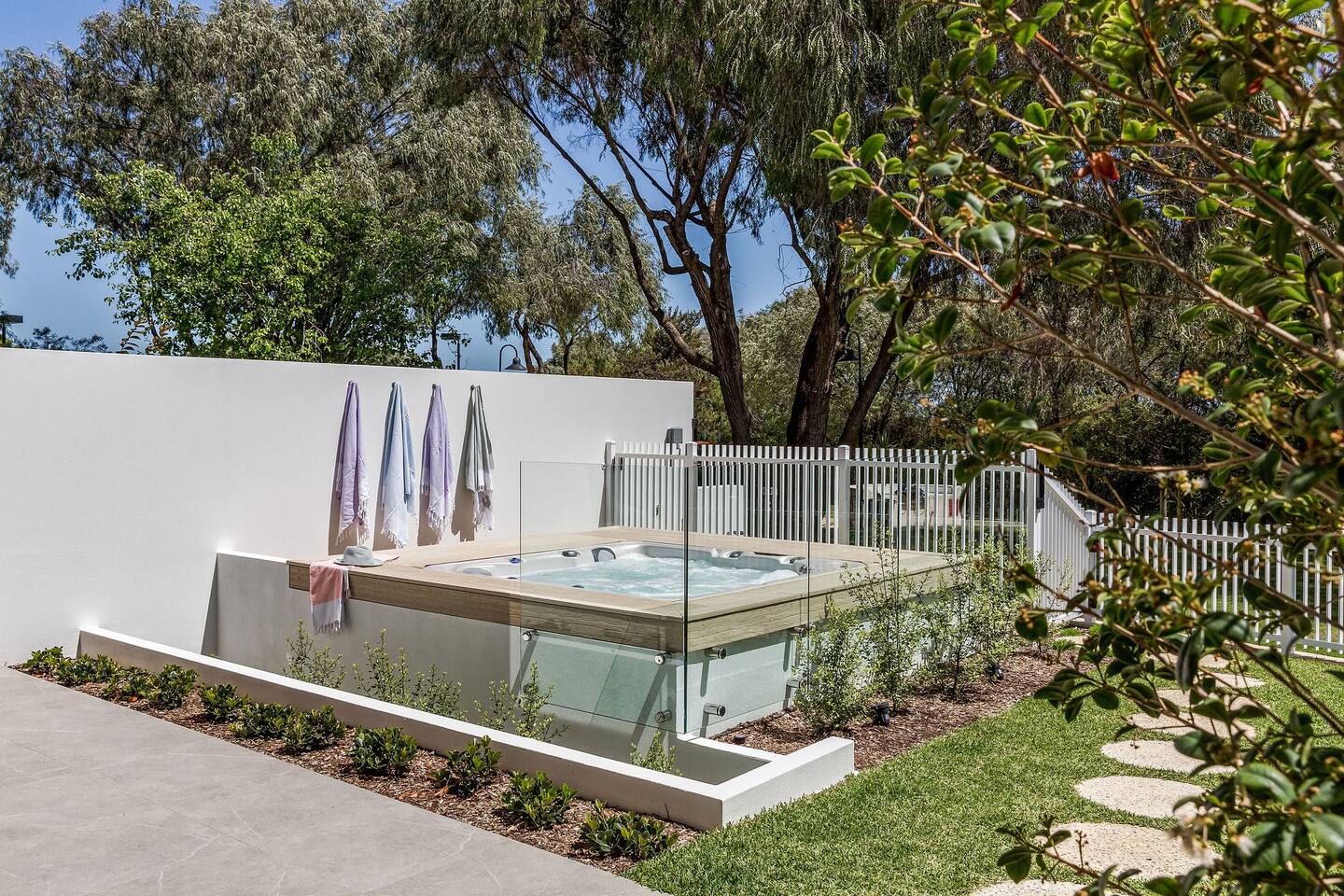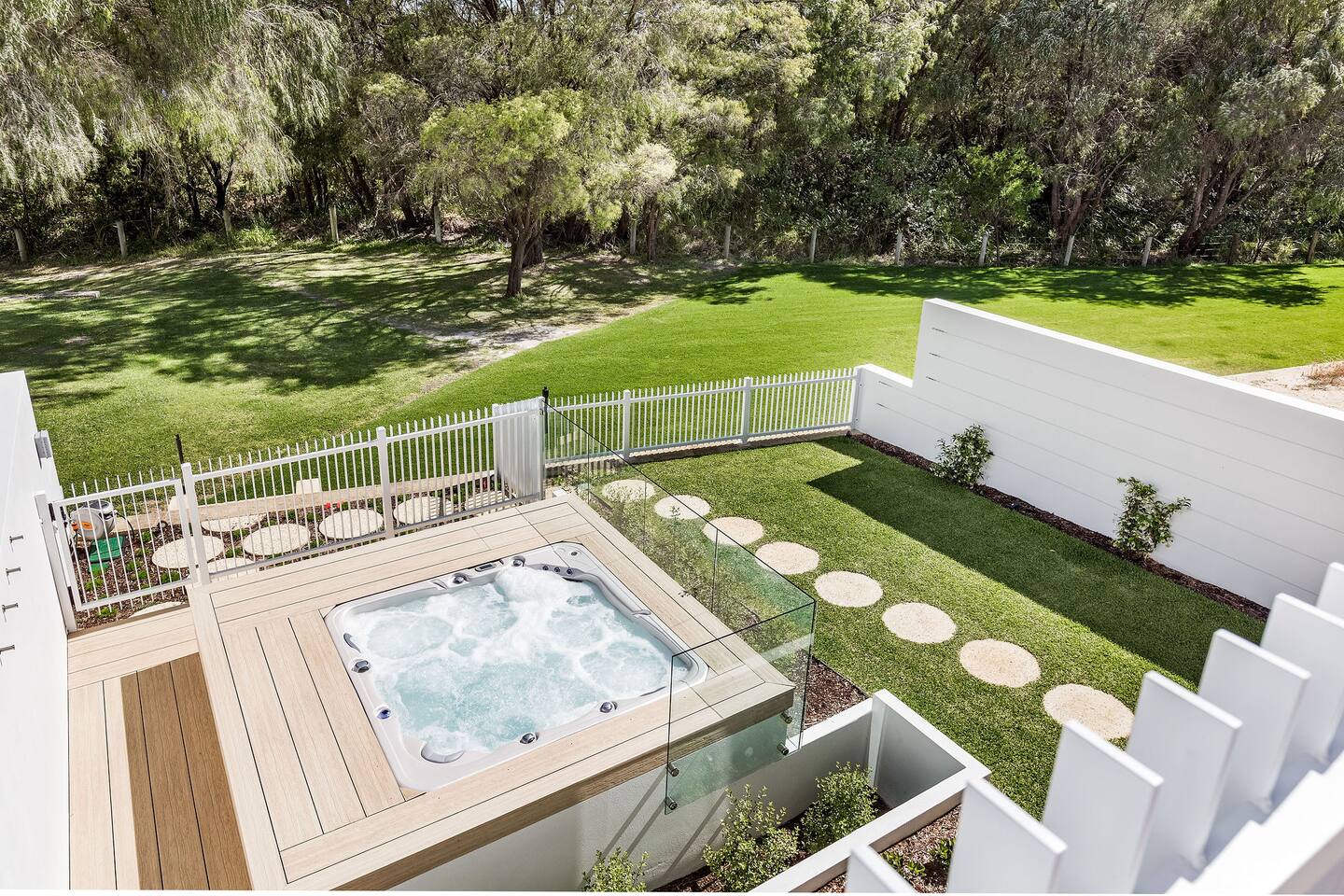 Among peppermint trees, in a lush, parkland setting, luxury meets the ocean at Hidden Ocean Retreat. This brand new, luxury home is only a minutes stroll over lawn to a pristine beach. Ducted air-conditioning & cosy gas fireplace, ensures year-round comfort. Gather in the heated, alfresco area for a BBQ or relax in the private outdoor spa. Lounge in sunshine from the balcony with ocean views. Enjoy access to neighbouring, Club Wyndham’s, heated pool, gym, tennis court, restaurant, bar & more!