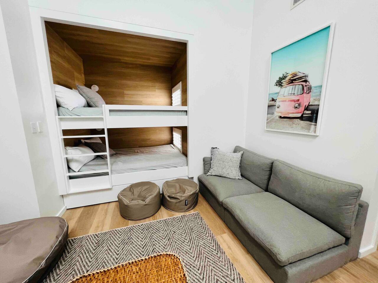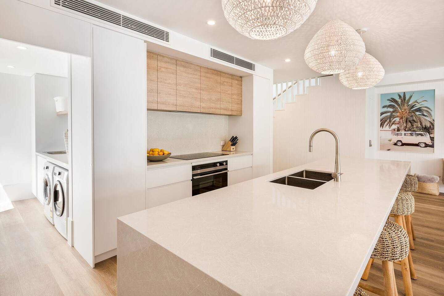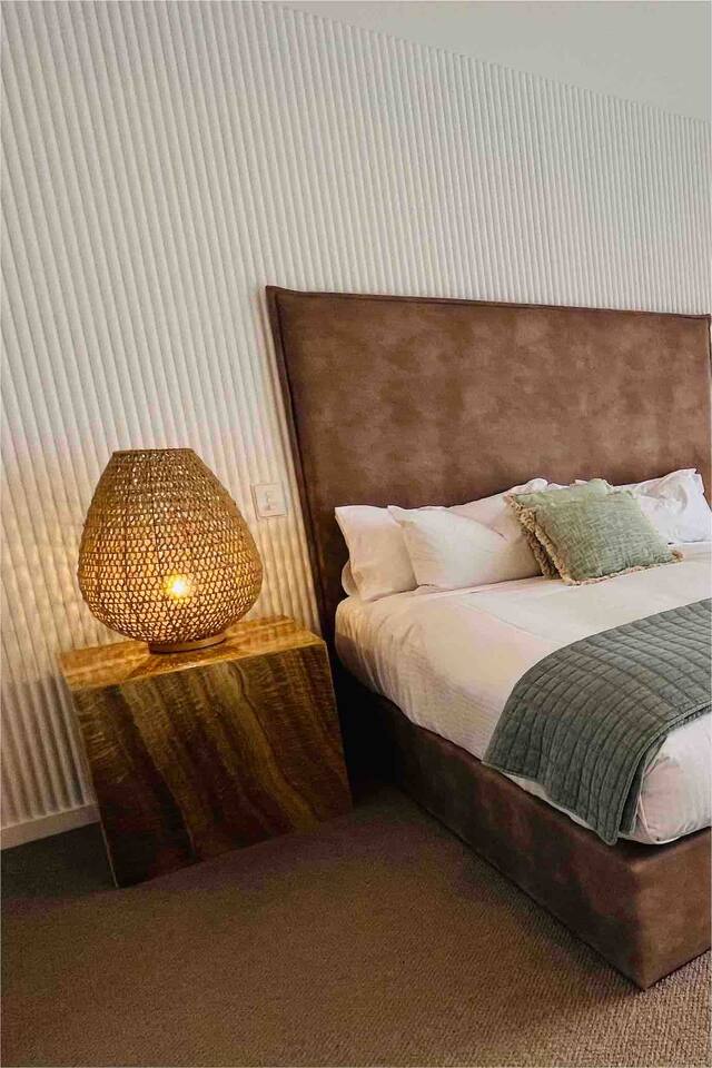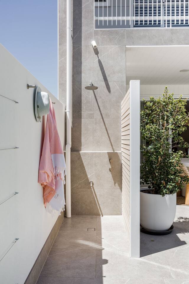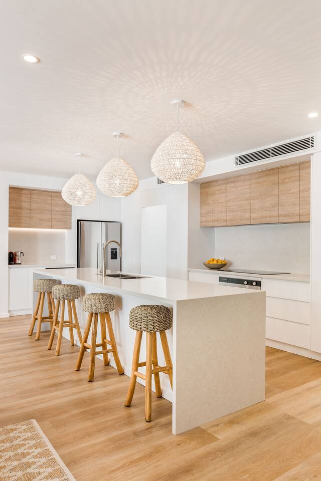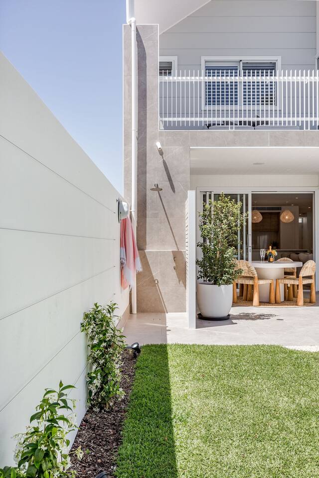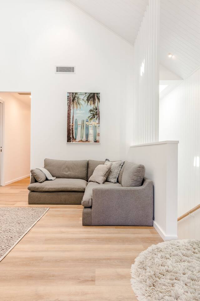 This brand-new 3/4 bedroom, 3.5 bathroom home, offers luxury, comfort and peaceful vibes with quality fittings and Scandinavian styling. A fully ducted heating and cooling system can be individually controlled from every room in the house. The spacious first-floor open plan dining, lounge and galley style kitchen, looks out over the outdoor alfresco area and beyond, to a lush parkland area scattered with shady peppermint trees. The parkland area provides the perfect space for children to play, all within view from the alfresco area. The parkland area and peppy trees is all that separates this amazing property from a beautiful, serene beach! The covered alfresco area boasts its own outdoor kitchen with inbuilt BBQ, as well as a lounge and dining area. A permanent heating system in the alfresco area ensures uninterrupted outdoor gatherings, even on cooler evenings. Back inside to the Scandinavian designed dining table, made from solid Australian Oak. Comfortably seating 9-10 people, with a choice of booth style seating running down one side of the table, or stylish dining chairs on the other. Cosy up in front of the gas fireplace on ultra-plush couches for a movie on the huge, 75 inch plasma TV. The spacious kitchen is an entertainers dream. Fitted with next-level quality appliances, including two dishwashers, double fridge/freezer with water filter, induction hot plate, oven, Nespresso coffee pod machine and more! Everything you’ll need to make meal preparation a breeze. Walk through the kitchen, into the separate laundry room to meet all of your clothes washing and drying needs. Heading upstairs to the rumpus room where you can enjoy natural lighting, or star gazing, from two stunning skylights set in the high raked ceiling. A second 75 inch screen TV is wall mounted with the ability to be swivelled each direction for viewing from the cushy lounges, or the custom built queen bunks. This uniquely designed room gives the option for a fourth bedroom if required. Three spacious bedrooms, all with private TV’s, huge wardrobes and stunning en-suite bathrooms, surround the rumpus room. Each bathroom has a heated towel rail and spacious showers with the ability to switch from regular to luxurious “rain” shower heads. A free-standing bath awaits you in the master king bedroom en-suite. Adjoining the main bedroom, the balcony with ocean views is the perfect spot for catching the sunshine with a good book, or a gin! The double enclosed car garage ensures both convenience and peace of mind. Extra parking bays are only a few strides away from the house.