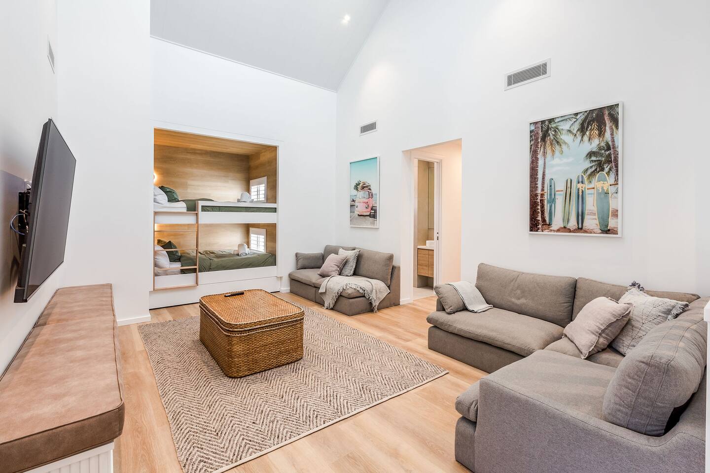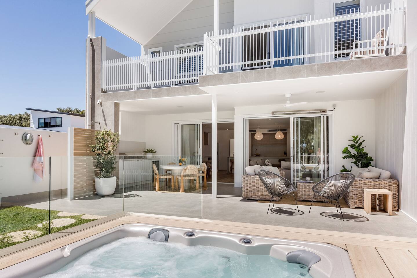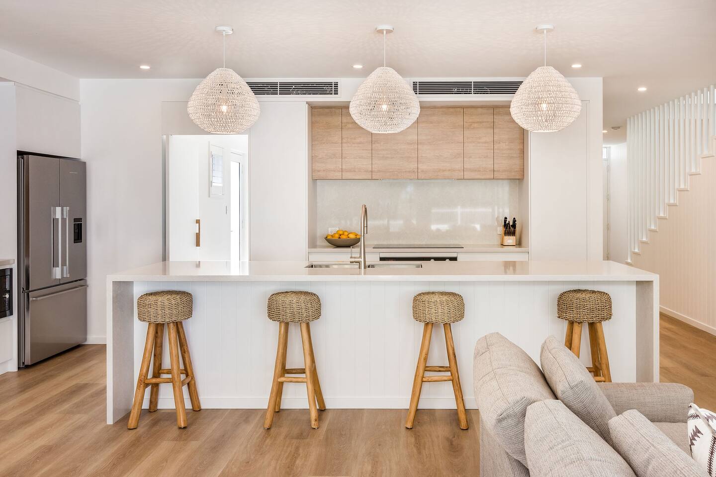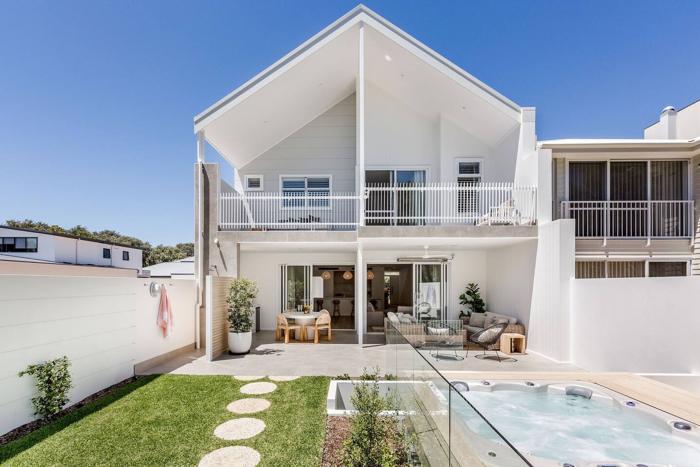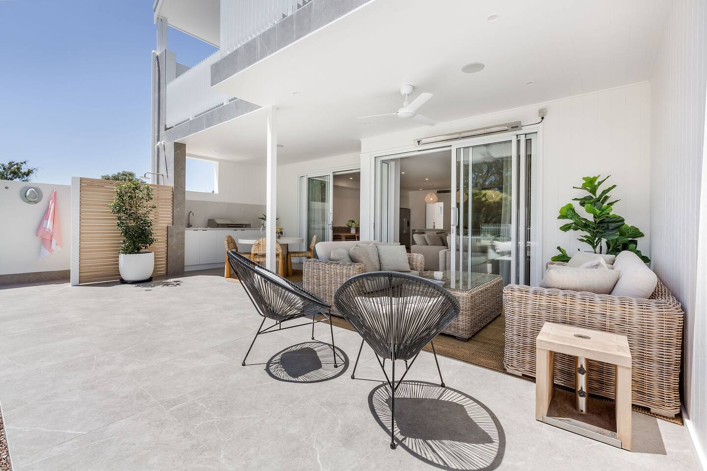 This brand-new 3/4 bedroom, 3.5 bathroom home, offers luxury, comfort and peaceful vibes with quality fittings and Scandinavian styling. A fully ducted heating and cooling system can be individually controlled from every room in the house. The spacious first-floor open plan dining, lounge and galley style kitchen, looks out over the outdoor alfresco area and beyond, to a lush parkland area scattered with shady peppermint trees. The parkland area provides the perfect space for children to play, all within view from the alfresco area. The parkland area and peppy trees is all that separates this amazing property from a beautiful, serene beach! The covered alfresco area boasts its own outdoor kitchen with inbuilt BBQ, as well as a lounge and dining area. A permanent heating system in the alfresco area ensures uninterrupted outdoor gatherings, even on cooler evenings. Back inside to the Scandinavian designed dining table, made from solid Australian Oak. Comfortably seating 9-10 people, with a choice of booth style seating running down one side of the table, or stylish dining chairs on the other. Cosy up in front of the gas fireplace on ultra-plush couches for a movie on the huge, 75 inch plasma TV. The spacious kitchen is an entertainers dream. Fitted with next-level quality appliances, including two dishwashers, double fridge/freezer with water filter, induction hot plate, oven, Nespresso coffee pod machine and more! Everything you’ll need to make meal preparation a breeze. Walk through the kitchen, into the separate laundry room to meet all of your clothes washing and drying needs. Heading upstairs to the rumpus room where you can enjoy natural lighting, or star gazing, from two stunning skylights set in the high raked ceiling. A second 75 inch screen TV is wall mounted with the ability to be swivelled each direction for viewing from the cushy lounges, or the custom built queen bunks. This uniquely designed room gives the option for a fourth bedroom if required. Three spacious bedrooms, all with private TV’s, huge wardrobes and stunning en-suite bathrooms, surround the rumpus room. Each bathroom has a heated towel rail and spacious showers with the ability to switch from regular to luxurious “rain” shower heads. A free-standing bath awaits you in the master king bedroom en-suite. Adjoining the main bedroom, the balcony with ocean views is the perfect spot for catching the sunshine with a good book, or a gin! The double enclosed car garage ensures both convenience and peace of mind. Extra parking bays are only a few strides away from the house.