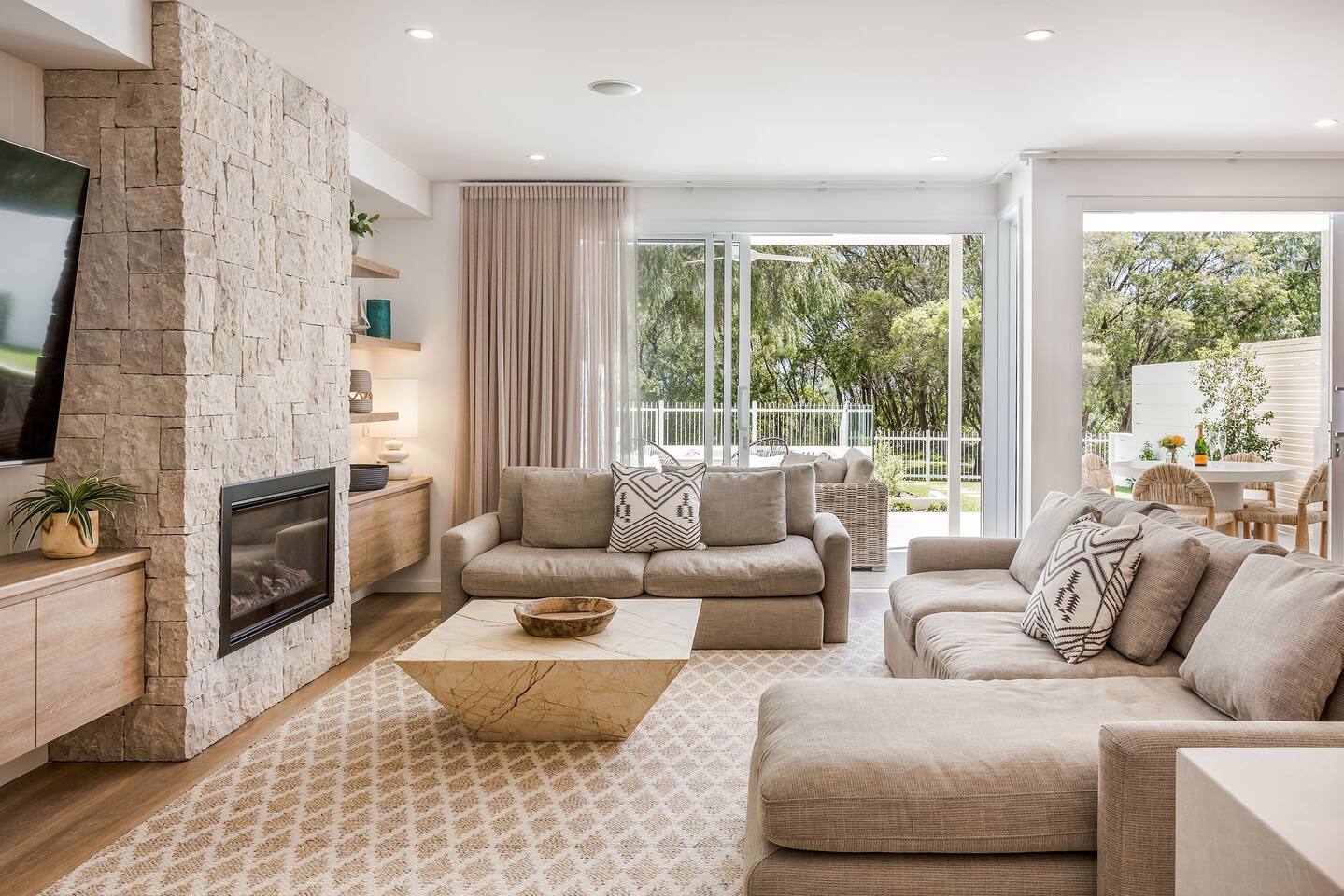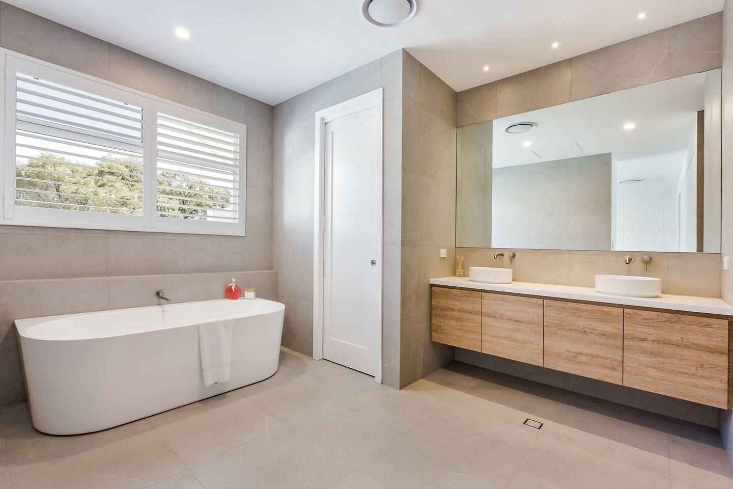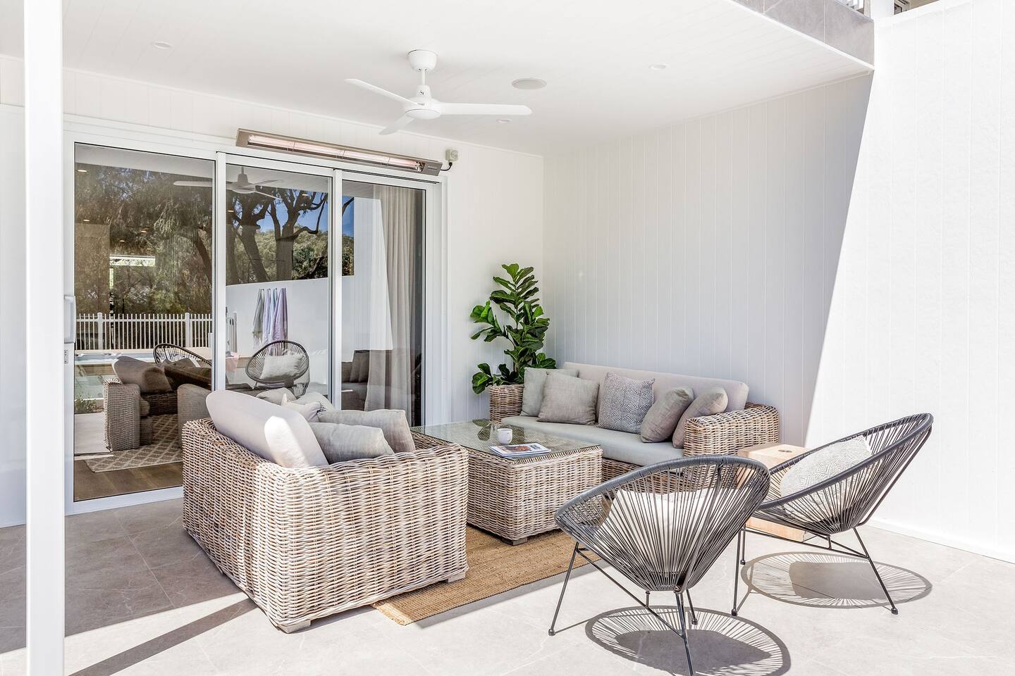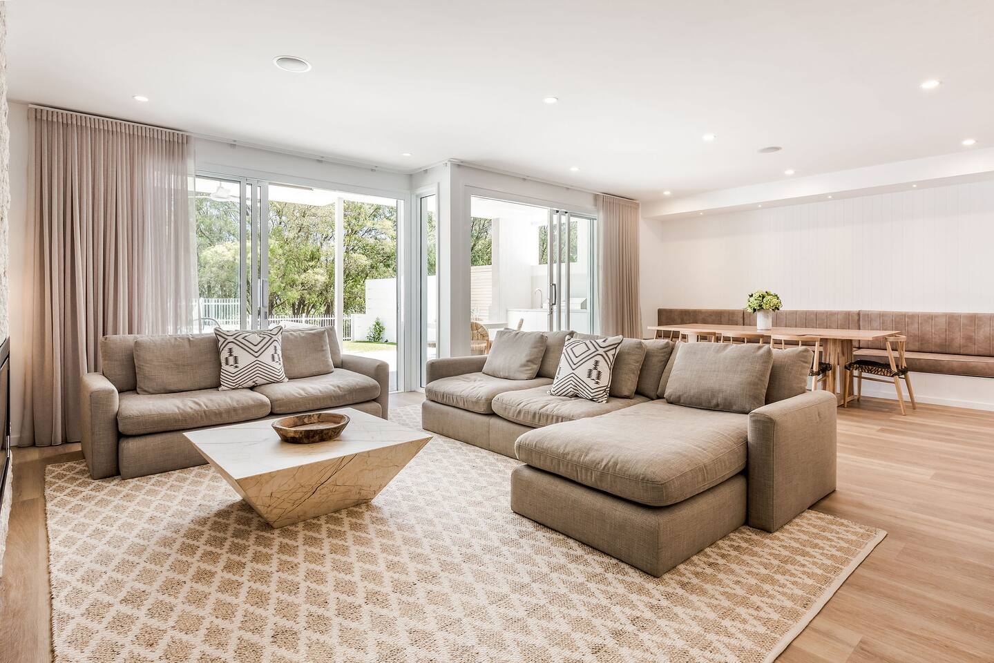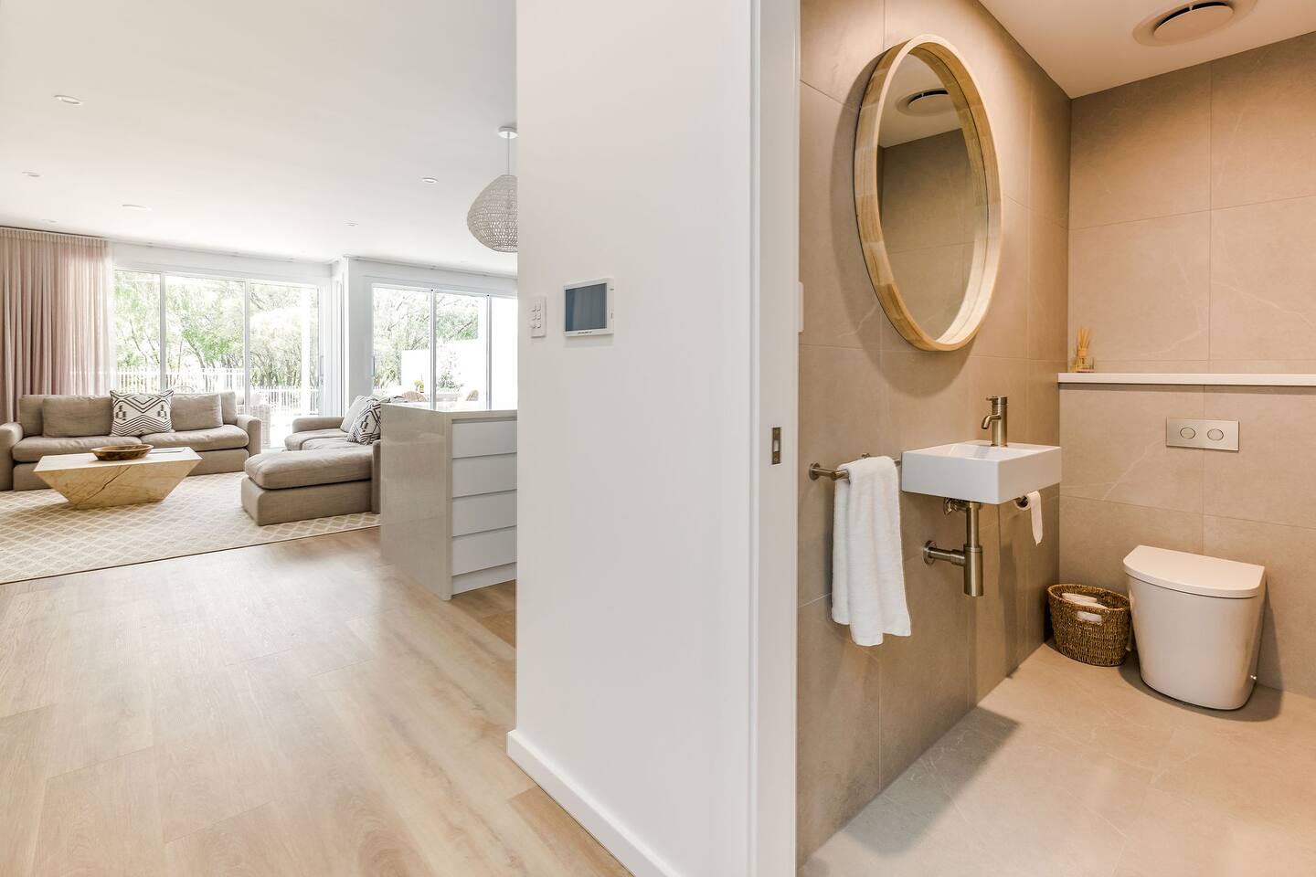 This brand-new 3/4 bedroom, 3.5 bathroom home, offers luxury, comfort and peaceful vibes with quality fittings and Scandinavian styling. A fully ducted heating and cooling system can be individually controlled from every room in the house. The spacious first-floor open plan dining, lounge and galley style kitchen, looks out over the outdoor alfresco area and beyond, to a lush parkland area scattered with shady peppermint trees. The parkland area provides the perfect space for children to play, all within view from the alfresco area. The parkland area and peppy trees is all that separates this amazing property from a beautiful, serene beach! The covered alfresco area boasts its own outdoor kitchen with inbuilt BBQ, as well as a lounge and dining area. A permanent heating system in the alfresco area ensures uninterrupted outdoor gatherings, even on cooler evenings. Back inside to the Scandinavian designed dining table, made from solid Australian Oak. Comfortably seating 9-10 people, with a choice of booth style seating running down one side of the table, or stylish dining chairs on the other. Cosy up in front of the gas fireplace on ultra-plush couches for a movie on the huge, 75 inch plasma TV. The spacious kitchen is an entertainers dream. Fitted with next-level quality appliances, including two dishwashers, double fridge/freezer with water filter, induction hot plate, oven, Nespresso coffee pod machine and more! Everything you’ll need to make meal preparation a breeze. Walk through the kitchen, into the separate laundry room to meet all of your clothes washing and drying needs. Heading upstairs to the rumpus room where you can enjoy natural lighting, or star gazing, from two stunning skylights set in the high raked ceiling. A second 75 inch screen TV is wall mounted with the ability to be swivelled each direction for viewing from the cushy lounges, or the custom built queen bunks. This uniquely designed room gives the option for a fourth bedroom if required. Three spacious bedrooms, all with private TV’s, huge wardrobes and stunning en-suite bathrooms, surround the rumpus room. Each bathroom has a heated towel rail and spacious showers with the ability to switch from regular to luxurious “rain” shower heads. A free-standing bath awaits you in the master king bedroom en-suite. Adjoining the main bedroom, the balcony with ocean views is the perfect spot for catching the sunshine with a good book, or a gin! The double enclosed car garage ensures both convenience and peace of mind. Extra parking bays are only a few strides away from the house.