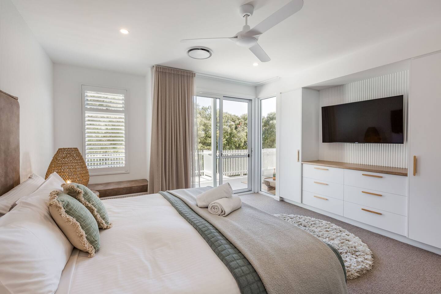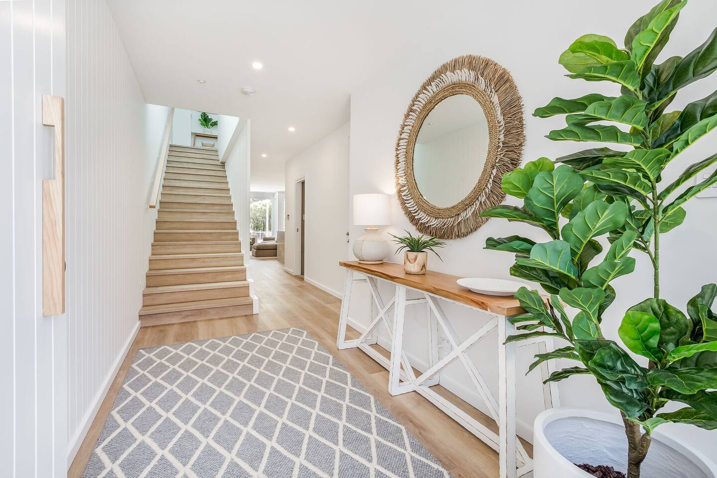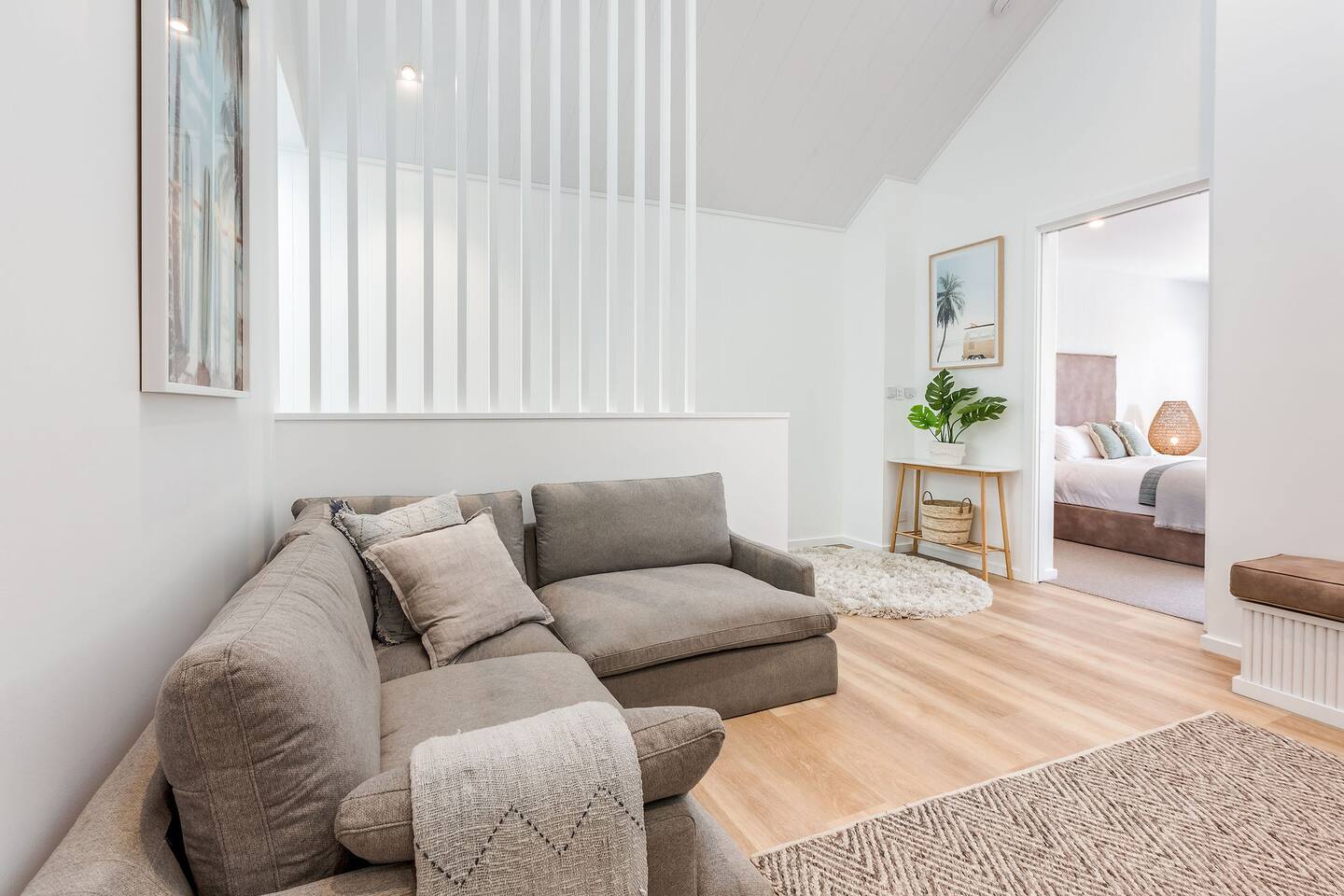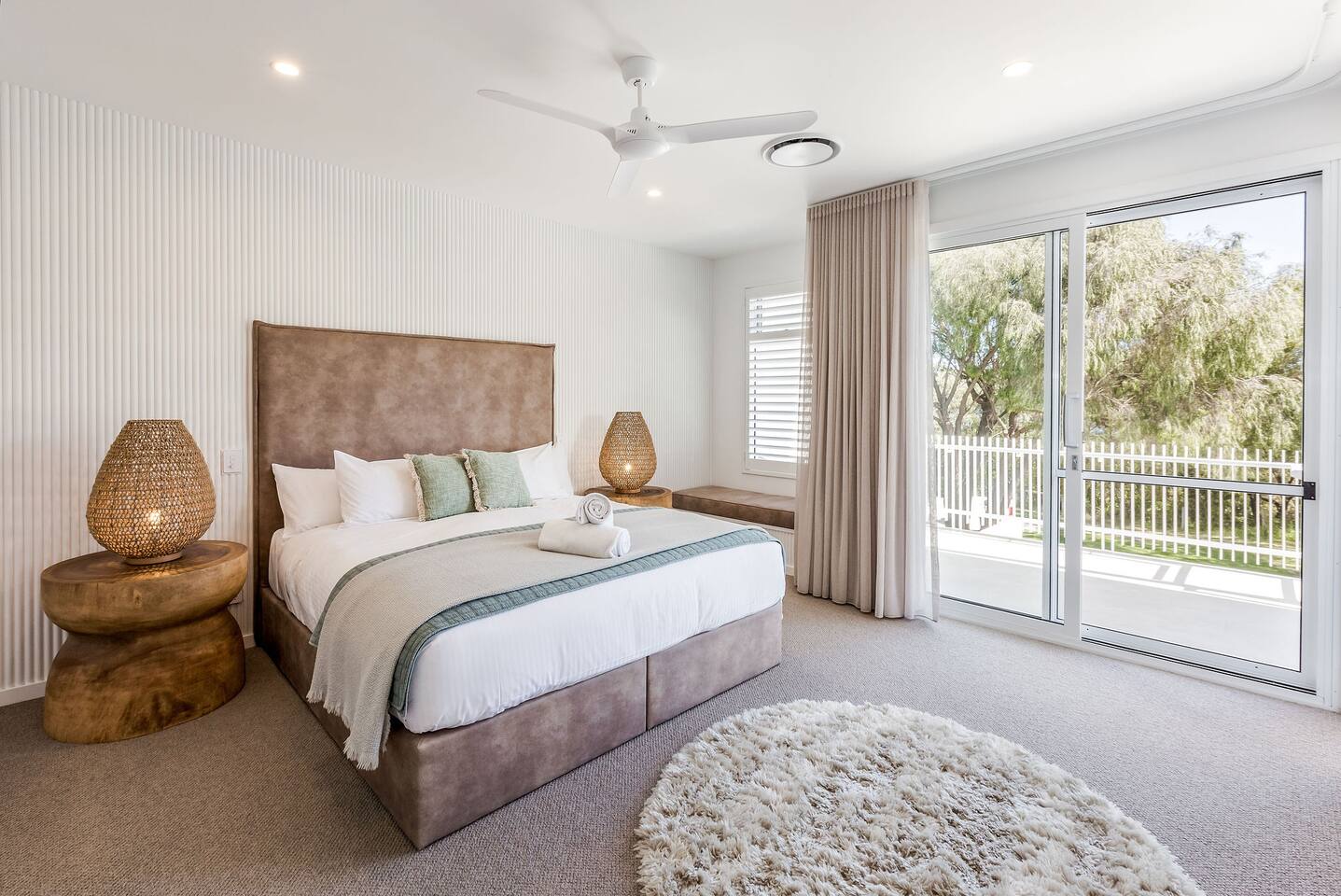 This brand-new 3/4 bedroom, 3.5 bathroom home, offers luxury, comfort and peaceful vibes with quality fittings and Scandinavian styling. A fully ducted heating and cooling system can be individually controlled from every room in the house. The spacious first-floor open plan dining, lounge and galley style kitchen, looks out over the outdoor alfresco area and beyond, to a lush parkland area scattered with shady peppermint trees. The parkland area provides the perfect space for children to play, all within view from the alfresco area. The parkland area and peppy trees is all that separates this amazing property from a beautiful, serene beach! The covered alfresco area boasts its own outdoor kitchen with inbuilt BBQ, as well as a lounge and dining area. A permanent heating system in the alfresco area ensures uninterrupted outdoor gatherings, even on cooler evenings. Back inside to the Scandinavian designed dining table, made from solid Australian Oak. Comfortably seating 9-10 people, with a choice of booth style seating running down one side of the table, or stylish dining chairs on the other. Cosy up in front of the gas fireplace on ultra-plush couches for a movie on the huge, 75 inch plasma TV. The spacious kitchen is an entertainers dream. Fitted with next-level quality appliances, including two dishwashers, double fridge/freezer with water filter, induction hot plate, oven, Nespresso coffee pod machine and more! Everything you’ll need to make meal preparation a breeze. Walk through the kitchen, into the separate laundry room to meet all of your clothes washing and drying needs. Heading upstairs to the rumpus room where you can enjoy natural lighting, or star gazing, from two stunning skylights set in the high raked ceiling. A second 75 inch screen TV is wall mounted with the ability to be swivelled each direction for viewing from the cushy lounges, or the custom built queen bunks. This uniquely designed room gives the option for a fourth bedroom if required. Three spacious bedrooms, all with private TV’s, huge wardrobes and stunning en-suite bathrooms, surround the rumpus room. Each bathroom has a heated towel rail and spacious showers with the ability to switch from regular to luxurious “rain” shower heads. A free-standing bath awaits you in the master king bedroom en-suite. Adjoining the main bedroom, the balcony with ocean views is the perfect spot for catching the sunshine with a good book, or a gin! The double enclosed car garage ensures both convenience and peace of mind. Extra parking bays are only a few strides away from the house.