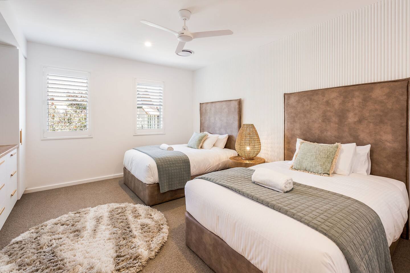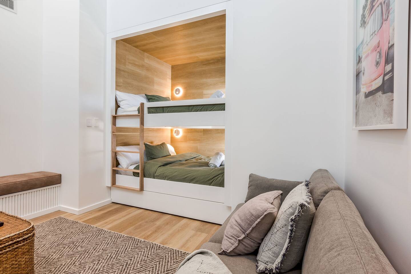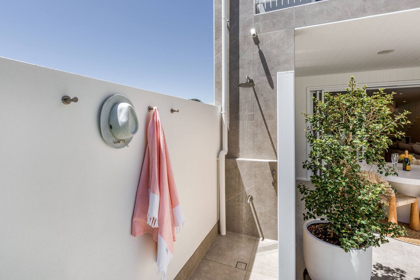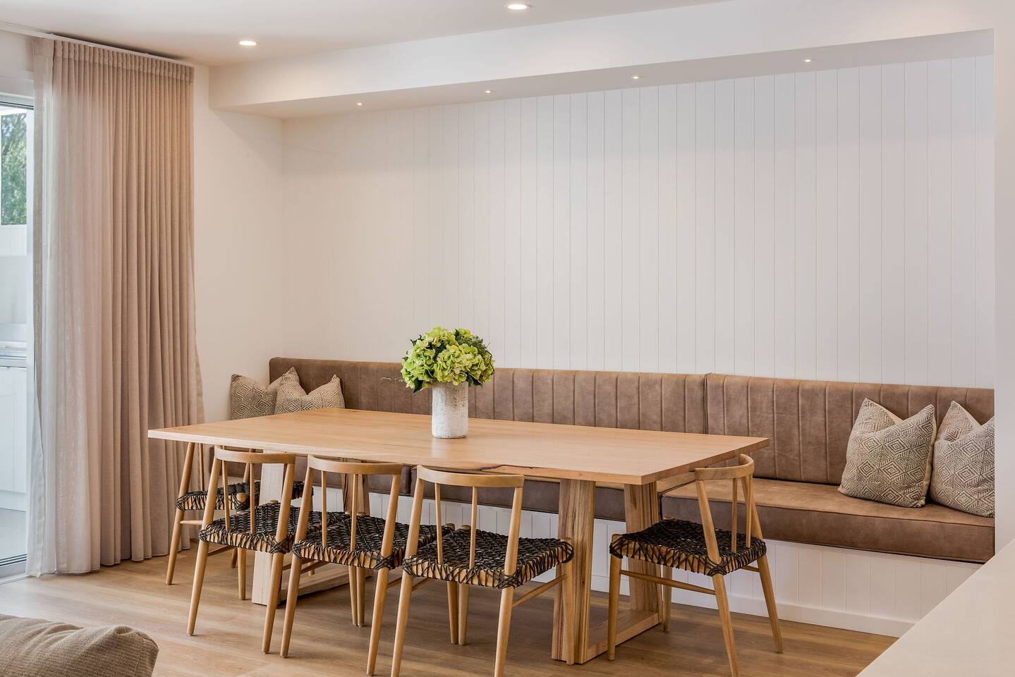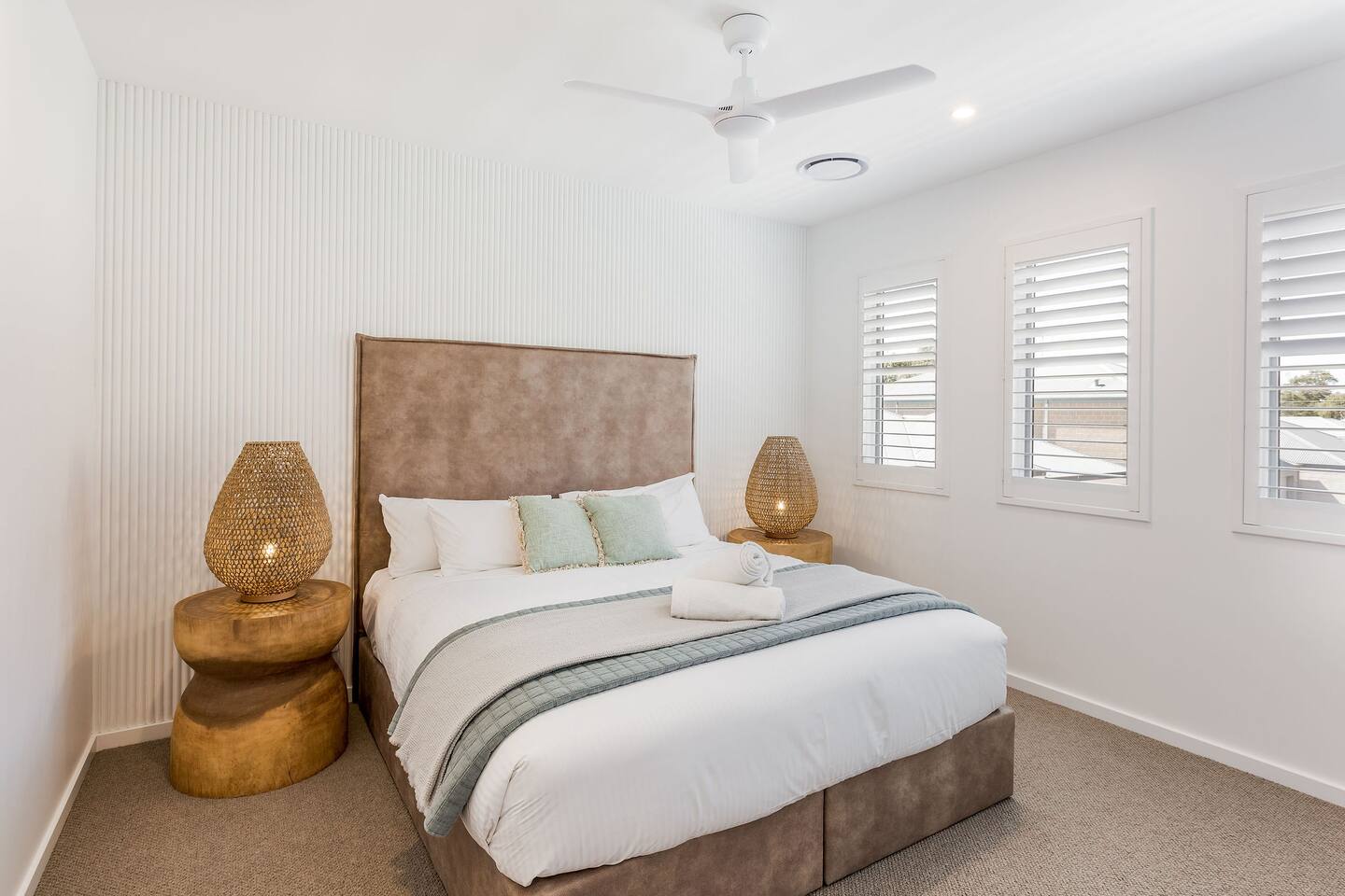 This brand-new 3/4 bedroom, 3.5 bathroom home, offers luxury, comfort and peaceful vibes with quality fittings and Scandinavian styling. A fully ducted heating and cooling system can be individually controlled from every room in the house. The spacious first-floor open plan dining, lounge and galley style kitchen, looks out over the outdoor alfresco area and beyond, to a lush parkland area scattered with shady peppermint trees. The parkland area provides the perfect space for children to play, all within view from the alfresco area. The parkland area and peppy trees is all that separates this amazing property from a beautiful, serene beach! The covered alfresco area boasts its own outdoor kitchen with inbuilt BBQ, as well as a lounge and dining area. A permanent heating system in the alfresco area ensures uninterrupted outdoor gatherings, even on cooler evenings. Back inside to the Scandinavian designed dining table, made from solid Australian Oak. Comfortably seating 9-10 people, with a choice of booth style seating running down one side of the table, or stylish dining chairs on the other. Cosy up in front of the gas fireplace on ultra-plush couches for a movie on the huge, 75 inch plasma TV. The spacious kitchen is an entertainers dream. Fitted with next-level quality appliances, including two dishwashers, double fridge/freezer with water filter, induction hot plate, oven, Nespresso coffee pod machine and more! Everything you’ll need to make meal preparation a breeze. Walk through the kitchen, into the separate laundry room to meet all of your clothes washing and drying needs. Heading upstairs to the rumpus room where you can enjoy natural lighting, or star gazing, from two stunning skylights set in the high raked ceiling. A second 75 inch screen TV is wall mounted with the ability to be swivelled each direction for viewing from the cushy lounges, or the custom built queen bunks. This uniquely designed room gives the option for a fourth bedroom if required. Three spacious bedrooms, all with private TV’s, huge wardrobes and stunning en-suite bathrooms, surround the rumpus room. Each bathroom has a heated towel rail and spacious showers with the ability to switch from regular to luxurious “rain” shower heads. A free-standing bath awaits you in the master king bedroom en-suite. Adjoining the main bedroom, the balcony with ocean views is the perfect spot for catching the sunshine with a good book, or a gin! The double enclosed car garage ensures both convenience and peace of mind. Extra parking bays are only a few strides away from the house.
